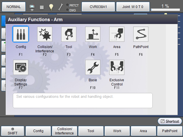 Display the menu to set various configurations required to move robot, "Tool coordinates" and "Work coordinates", and "Area","PathPoint".