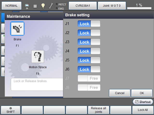 To unlock/lock brakes only for some joints, select unlock or lock by directly touching the Lock/Free display of corresponding joints on the Remote TP/Virtual TP.