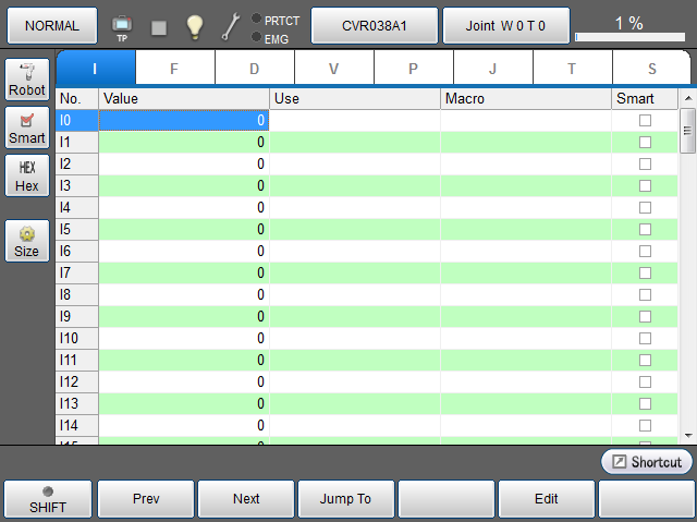 Select the variable number to display in variable tab, and press [Jump To] to display ten key. Enter variable number with ten key, and press [OK] to move to the target variable number. Some elements for the selected variable number will be highlighted. This can be also selected by using up and down cursor keys on the Remote TP/Virtual TP. |