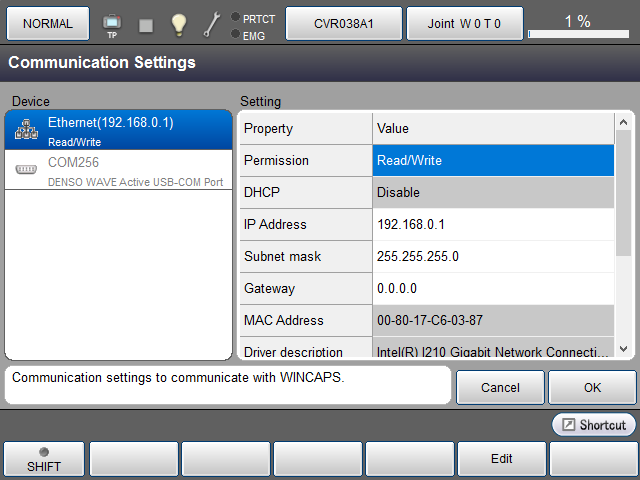 Set the permission and IP address for communications through Ethernet between WINCAPSIII and the COBOTTA. Also, specify the full/half duplex setting for serial data communications.