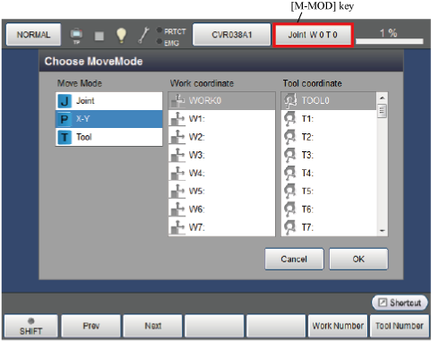 Select items to set for "Move Mode", "Work coordinate", and "Tool coordinate" by using up, down, left and right cursor keys on the Remote TP/Virtual TP. This can be also selected by directly touching the screen.