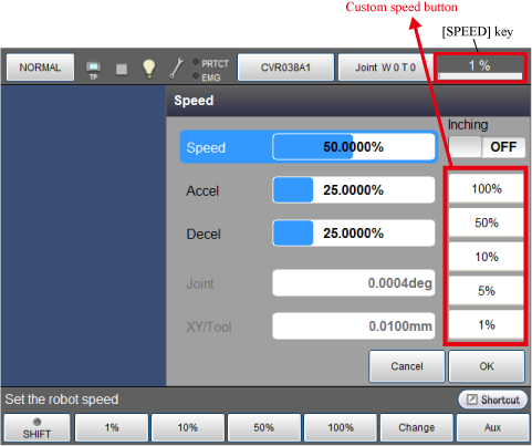 Select items, "SPEED", "ACCEL" or "DECEL", and press [10%]. Then, the display for settings will be changed to 10%. |