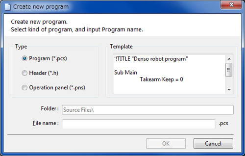 When a Program (*.pcs) or Header (*.h) radio button is selected, a new file that have the same contents as template will be created, and Program Edit window will be displayed in Program view.
