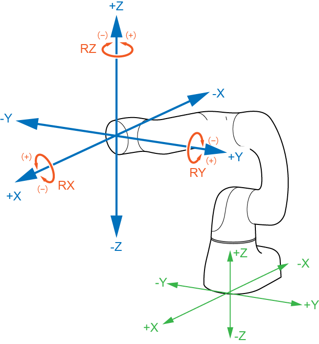 The X-Y mode allows user to drive the robot arm in base coordinates (whose origin is defined at the center of the robot basement). Pressing the X, Y, or Z key in the X-Y mode moves the robot flange linearly along the X, Y, or X axis, respectively, as shown below.