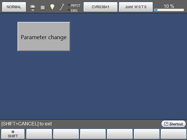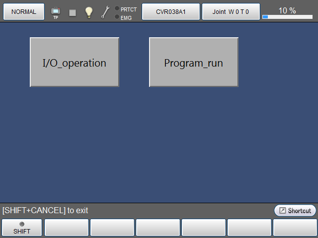 The following example illustrates the procedure for creating two buttons: one (labeled "I/O operation") that turns I/O variable #24 on as long as it is pressed and another (labeled "Program_run") that runs a program (Sample pro).