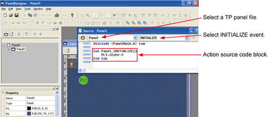 When selecting the panel from the TP panel, Initialize event becomes selectable, then, Initialize event code is automatically created.