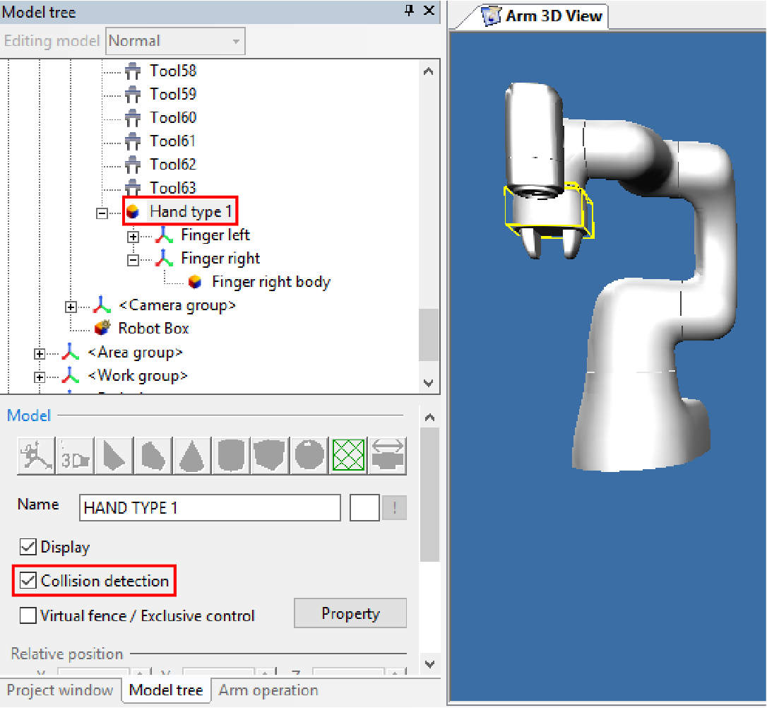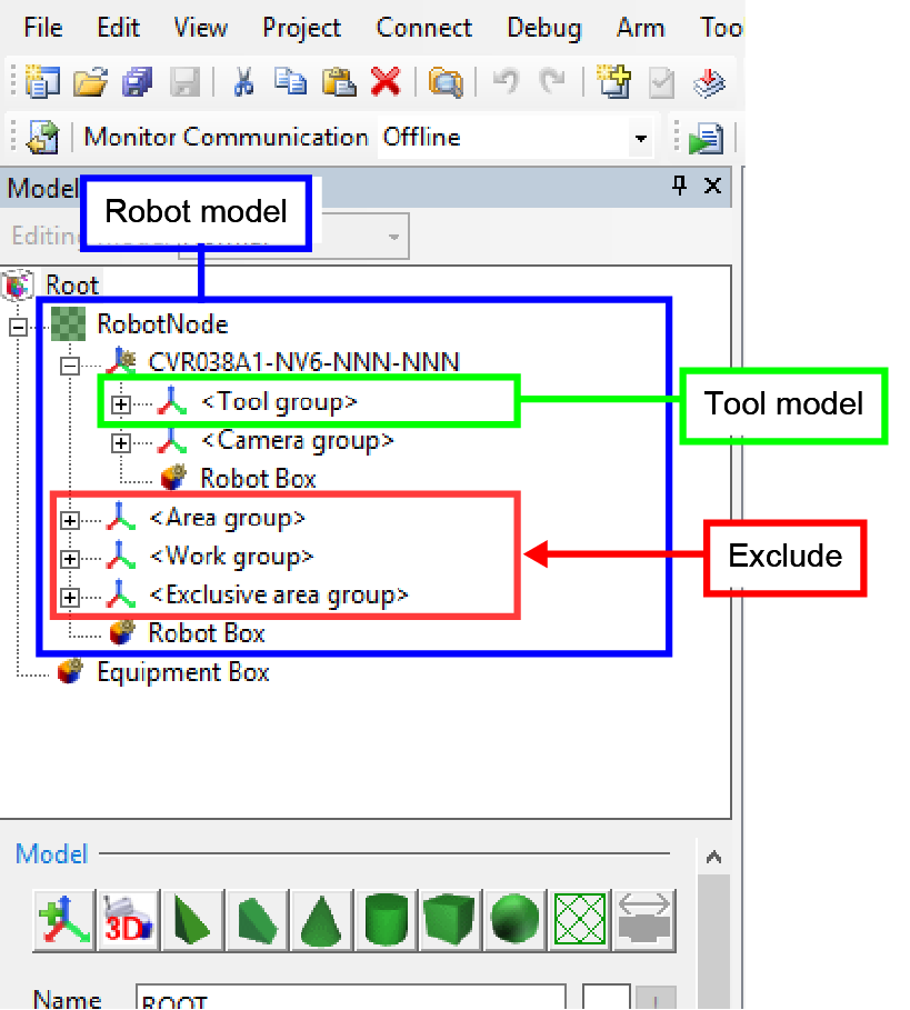 | Robot model | Objects that exist below the Robot node. Tool group, Area group, Work group, and Exclusive area group are excluded. | - |