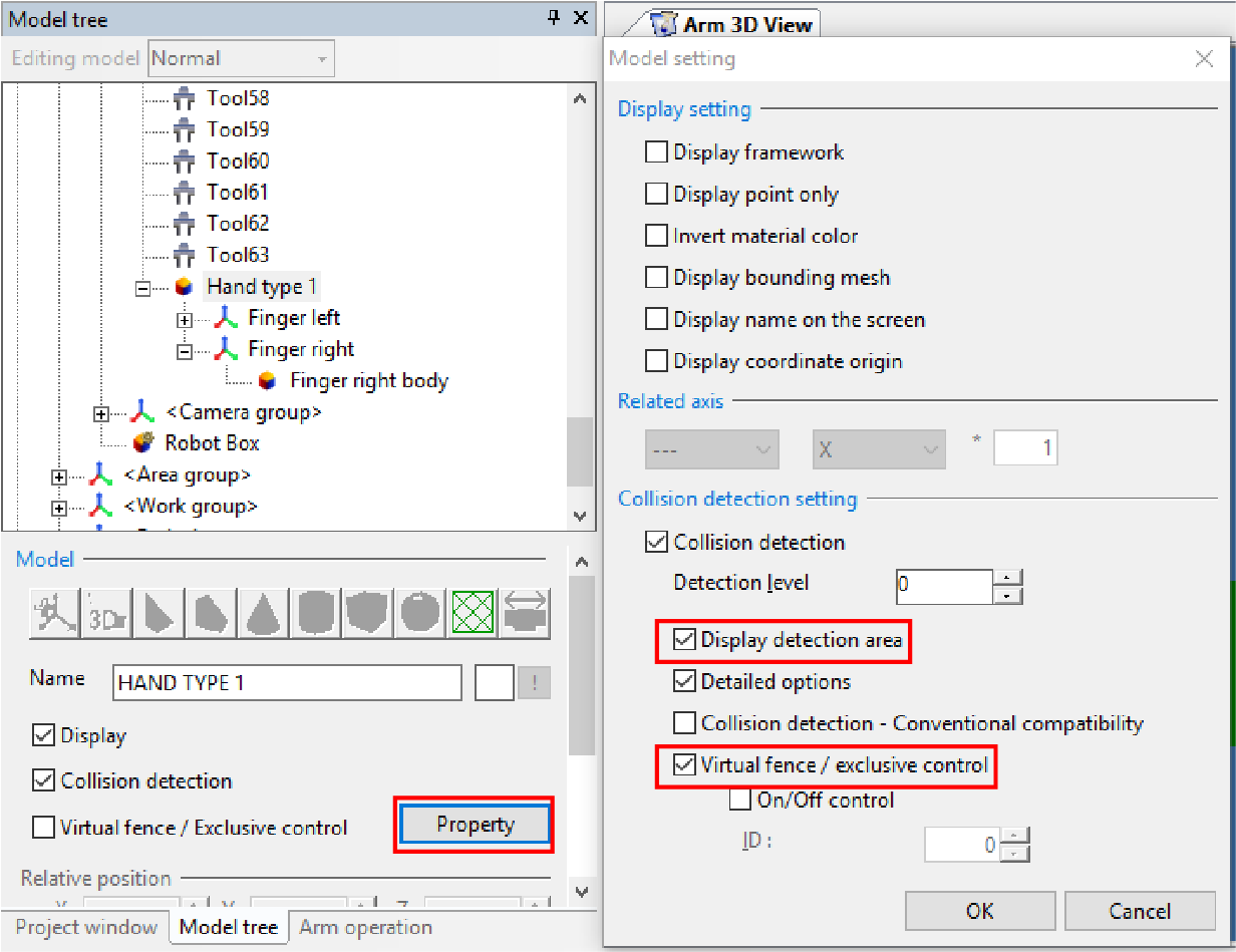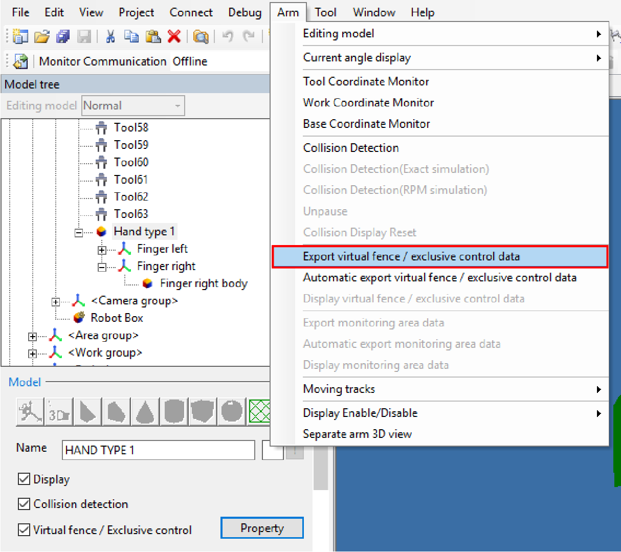 To check output exclusive control data, select [Arm] - [Display virtual fence / exclusive control data].