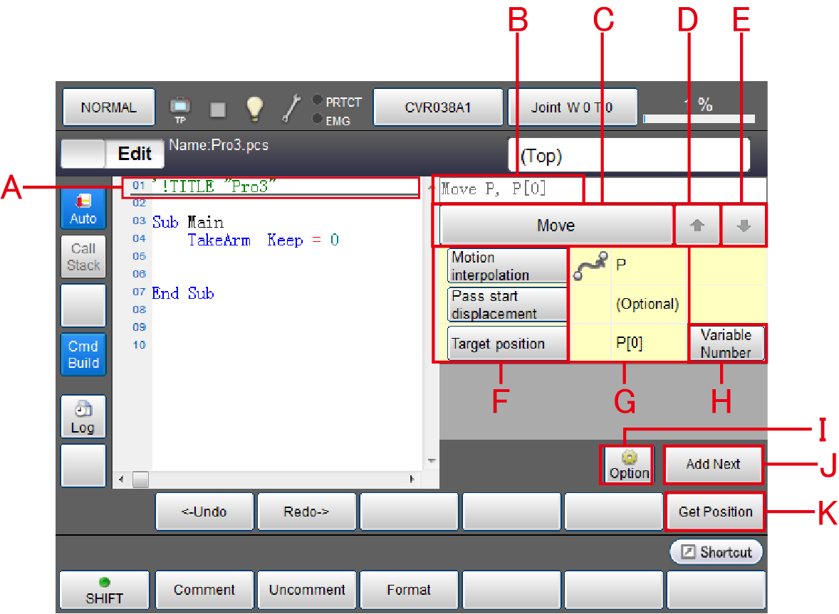 | A | Command adding cursor | This specifies a line where a new command will be added. To move this cursor, touch the screen directly, or use the up-and-down arrow keys. |