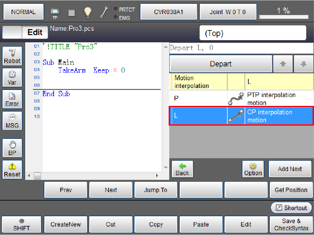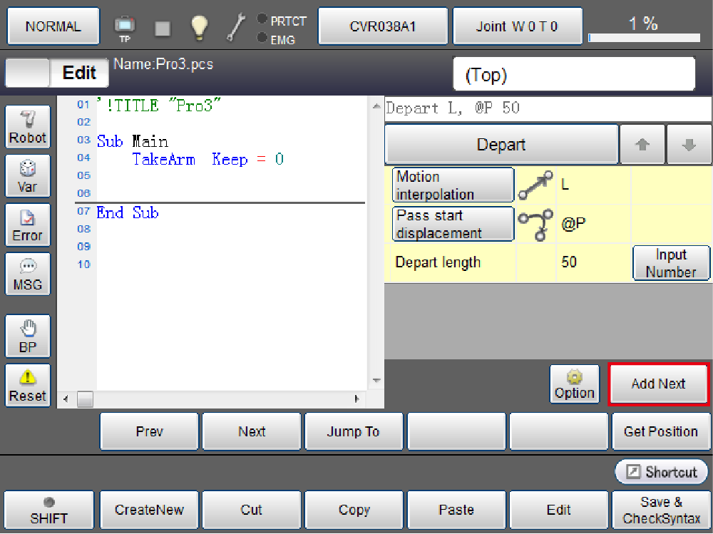 | I | Option button | Display the options when [Add Next] is selected with the Approach or Move command.Select from the following three and press the [OK] button.