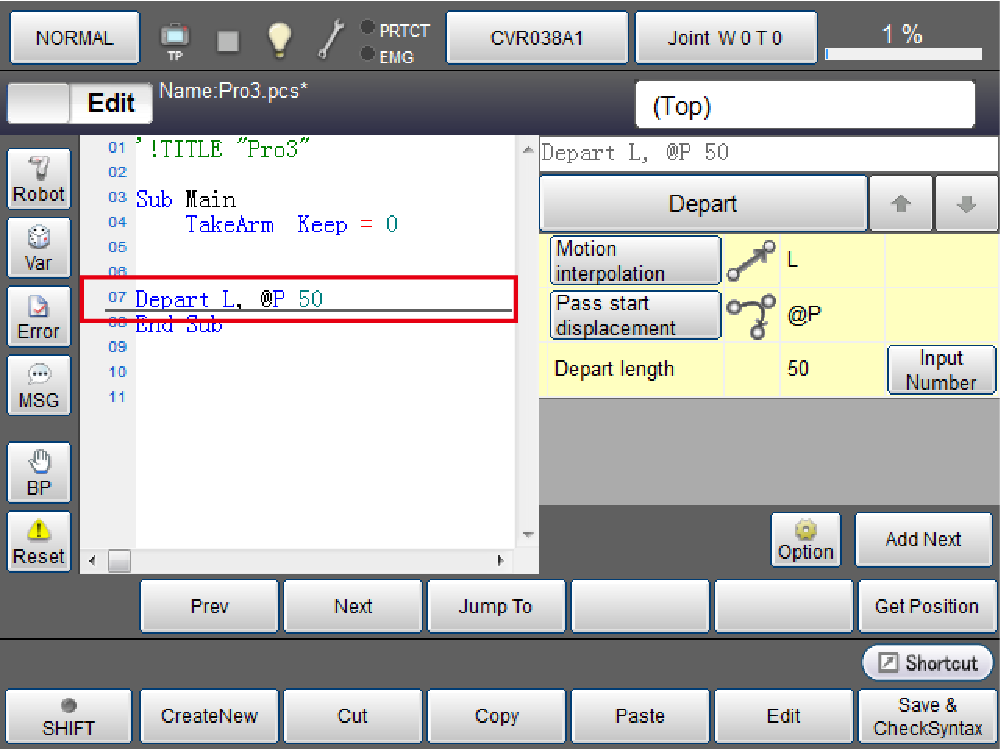 In this example, "Depart L, @P 50" is inserted in the seventh line of the program.