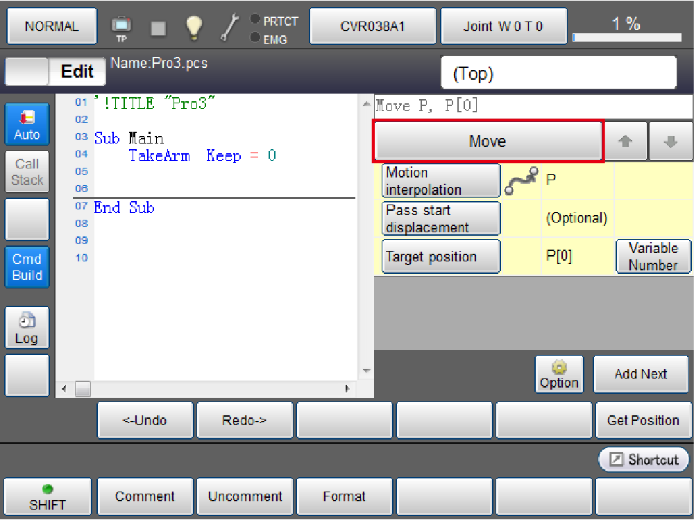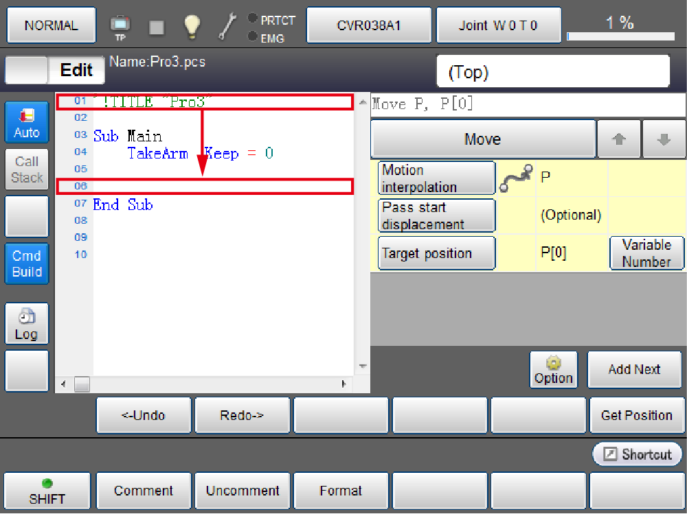 Press [F1 Program]. Once a program list is displayed, select a program file to edit. Press [F5 Edit], and then press [Shift]. Press [CmdBuild] on the left of the screen.