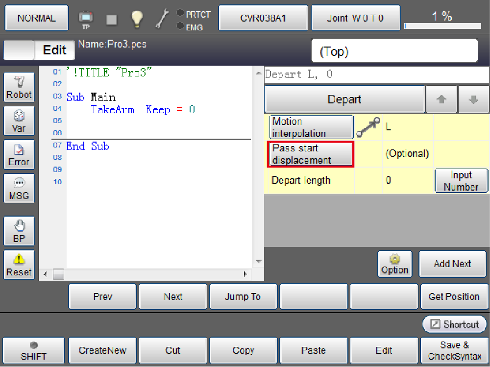 Set the distance of pass start displacement. Press [Pass start displacement] button.