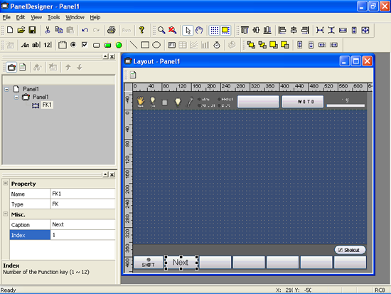 Load the editor and place the function key anywhere on the panel layout in the Layout window. Note, however, that the final result will not appear at this position, but on the corresponding function key on Remote TP/Virtual TP screen.