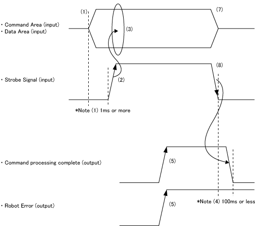 The command input with a Strobe Signal should be preceded by the output of the Robot Initialized. If a Robot Error signal has been issued, however, execute a Clear Robot Error (001) since no Robot Initialized will be issued. - The COBOTTA reads the command area and the data area according to the input of Strobe Signal.