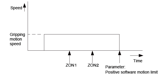 In Constant-Speed Movement and Grip with ZON Output (CLOSE) mode, the fingers move to a closing direction software motion limit. In Constant-Speed Movement and Grip with ZON Output (OPEN) mode, on the other hand, the fingers move to an opening direction software motion limit.The fingers, when entering the gripping state while moving, enter the Hold state.