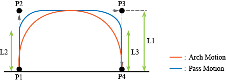 Be careful with interference with the surrounding facilities when the robot is in arch motion. Under the arch motion control, all robot operations are performed via point-to-point (PTP) moves.