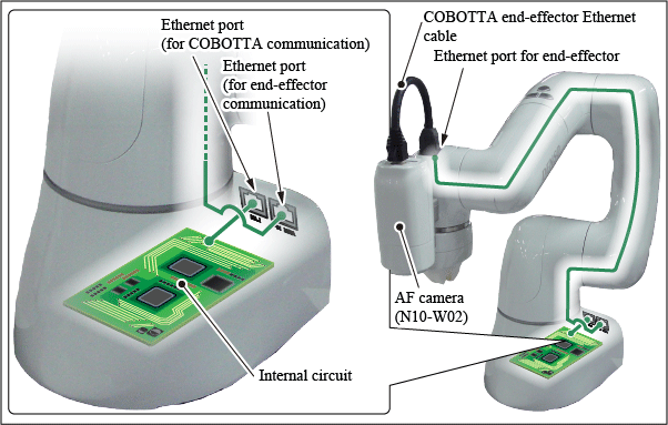 To control the AF camera (N10-W02), use an Ethernet cable to connect the AF camera (N10-W02) and the internal circuit of COBOTTA. The Ethernet port (for end-effector communication) is connected via the internal wiring of COBOTTA to the end-effector Ethernet port but is not connected to the internal circuit.