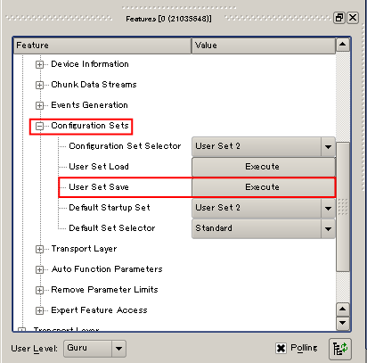 To save the conditions being set, click the "Execute" button under User Set Save.