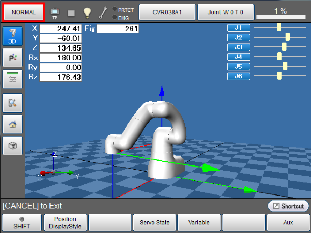 Note that you cannot operate the robot with motion direction keys if the operation mode is direct mode or direct preparation mode. Switch to the normal mode. For about how to switch the operation mode, refer to "Switching Between Operation Modes".