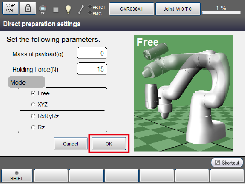 | Mode | Free | Assists the adjustment of teaching by retaining the position and posture. Fress: The position and posture can be changed freely. |