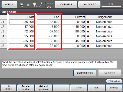 Do not enter the motion area of robot during diagnosis motion. Robots may perform unexpected behavior.