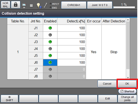 Select the axis numbers for which to enable the collision detection function and press [Enable] or [F5 Edit] for each axis number.