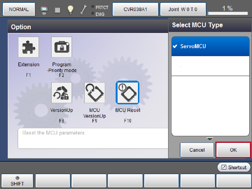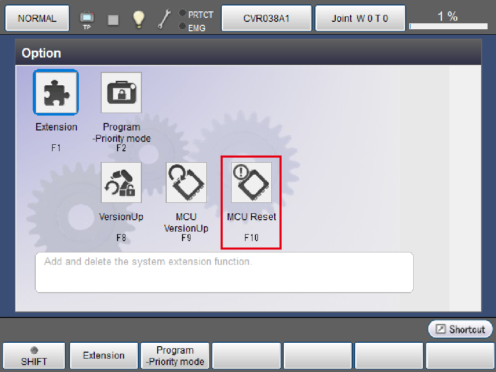 Operation path: Top window - [F6 Setting] - [F2 Option] - [F10 MCU Reset]