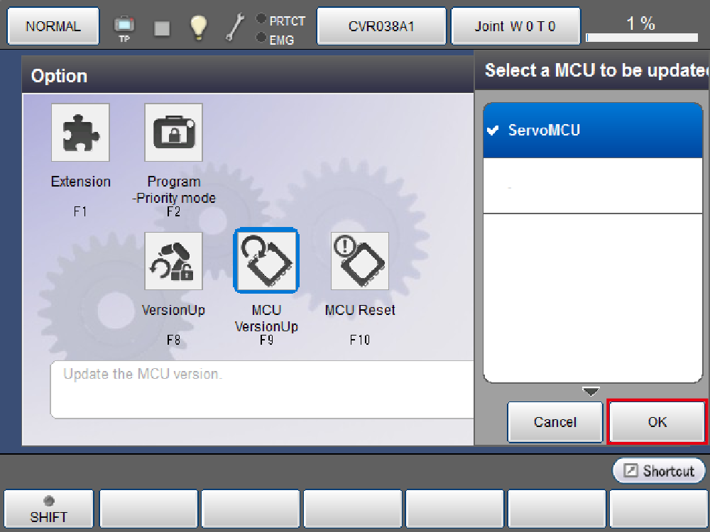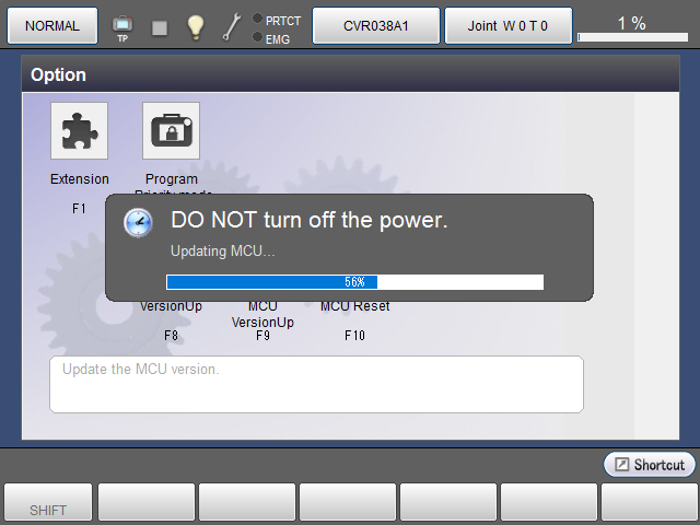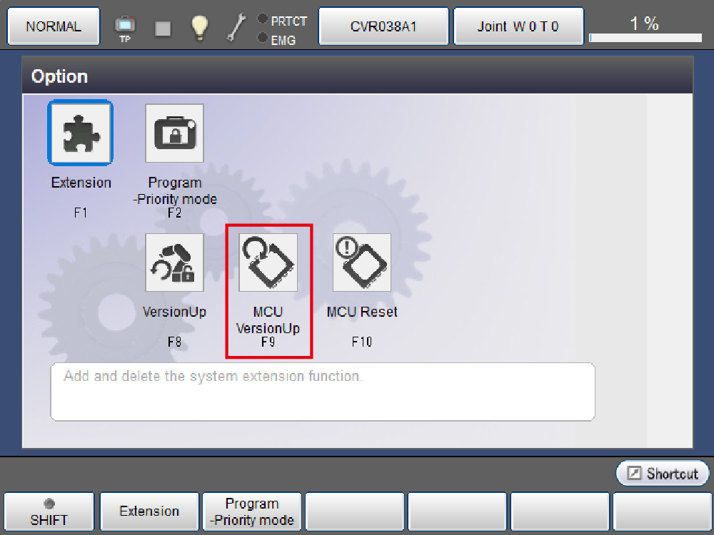 Operation path: Top window - [F6 Setting] - [F2 Option] - [F9 MCU VersionUp]