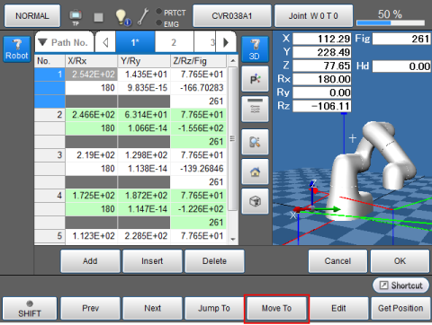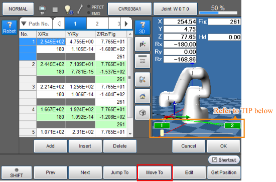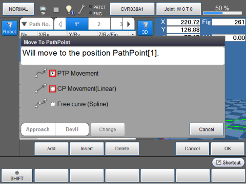 Pressing [Move To] displays [Mote To PathPoint] window. Select [PTP Movement] or [CP Movement (Linear)].