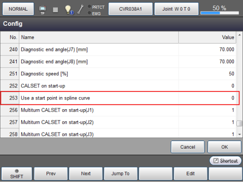 For operating the robot with free curve motion in the [Path Points Setting] window, you need to set [253: Use a start point in spline curve] to (1: Enable).
