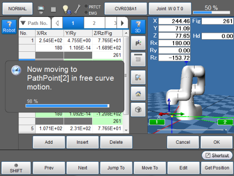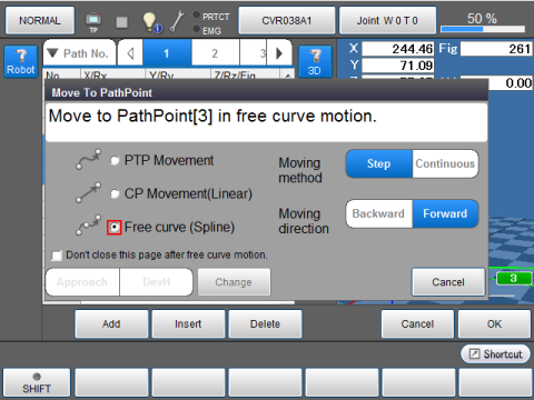 If the first and the last path points are the same position, or if the path goes through an identical path point twice or more with different robot posture, when you perform [F4: MoveTo] - [Move To PathPoint] - Free curve (Spline), the robot may move unexpected way.