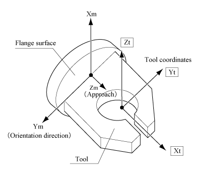 The X, Y, and Z axes in tool coordinates are expressed by Xt, Yt, and Zt, respectively, as shown below.
