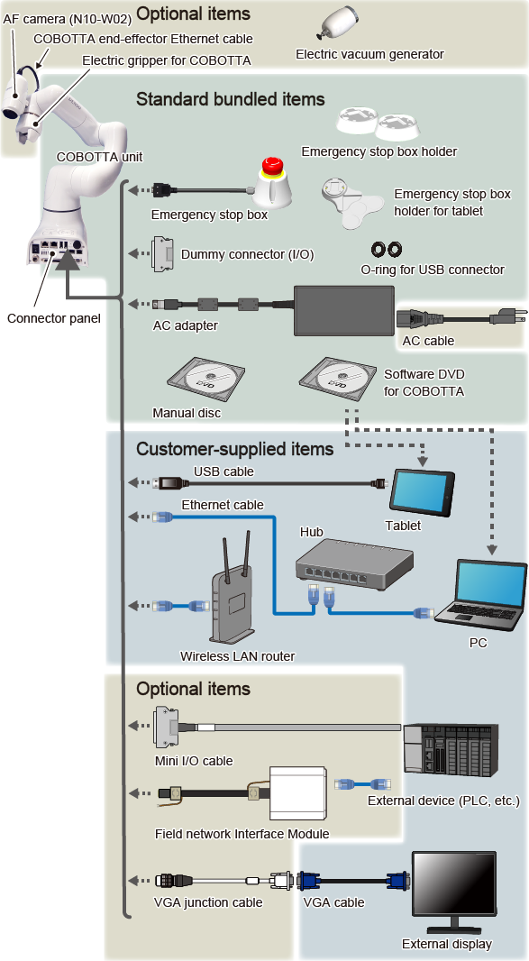 All connectors used to connect each device to the COBOTTA unit are provided here.
