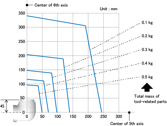 The following graph indicates the allowable range of the distance from the intersection of the rotational center axis of the 6th axis and that of the 5th axis to the center of gravity of the tool-related part, for each total mass of tool-related parts.