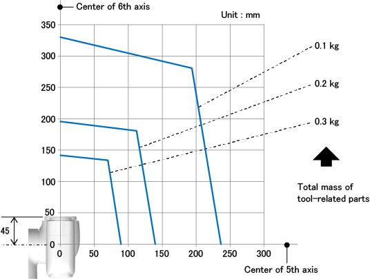 The following graph indicates the allowable range of the distance from the intersection of the rotational center axis of the 6th axis and that of the 5th axis to the center of gravity of the tool-related part, for each total mass of tool-related parts.