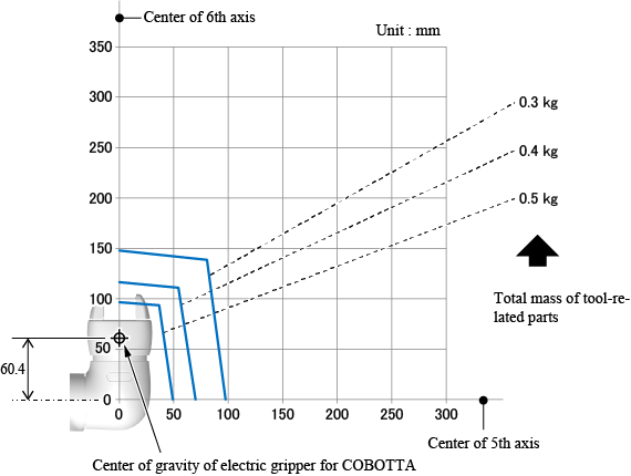 The following graph indicates the allowable range of the distance from the intersection of the rotational center axis of the 6th axis and that of the 5th axis to the center of gravity of the tool-related part, for each total mass of tool-related parts.