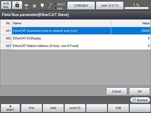 To prevent such error, adjust "EtherCAT Insensitive time to network error [ms]" of Fieldbus parameter longer.