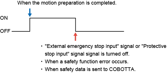 The signal is turned ON when COBOTTA is in the motion preparation status after you perform "Mode switching" of I/O Command or the instructions described in "Motion Preparation".