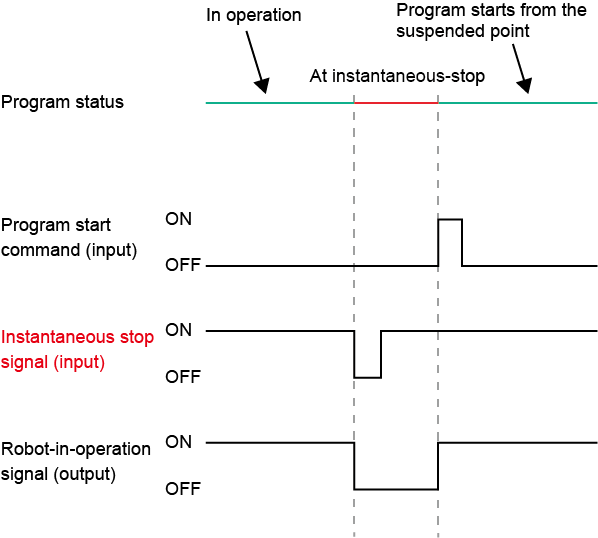 If the state of this signal is turned from on to off, the robot will immediately stop in the middle of the ongoing step, and the "Robot-in-operation (output)" signal will be turned off. The suspended program will resume by I/O command "Program start" input.