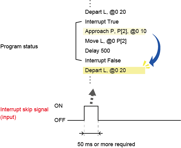 In this case, once the Interrupt Skip signal turns on, Approach motion will be stopped immediately and the program moves to Depart command.