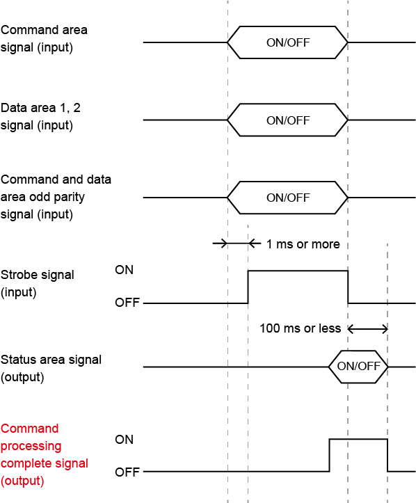 - If the strobe signal is turned off, before command processing is completed, the command processing complete signal will be output and then turned off within 100 ms.