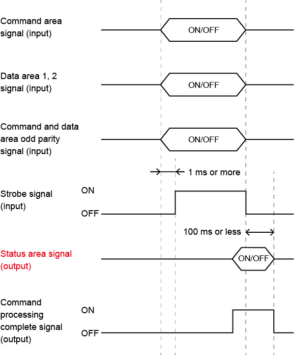 - If the strobe signal is turned off, before command processing is completed, the status signal will be output and then turned off within 100 ms.