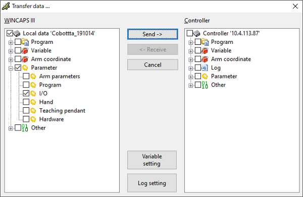 Once the setting is complete, select [I/O] check box to transfer projects to COBOTTA.