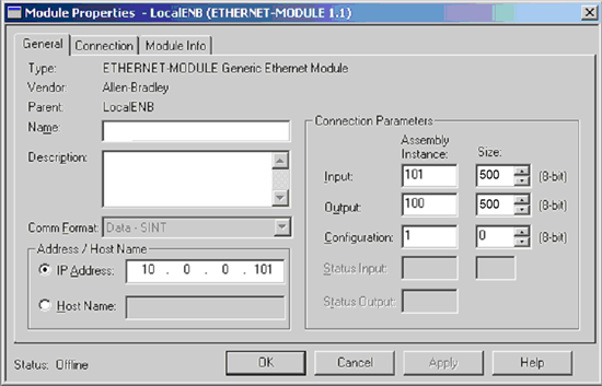 This example shows how to set the size of input/output areas to 500 bytes each from the Rockwell Automation PLC.