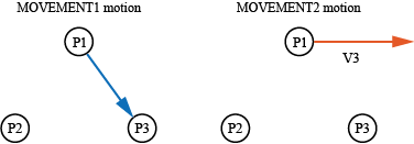 With “MOVEMENT1,” the robot moves to point P3 with an absolute motion, however, ”MOVEMENT2” moves by V3 from the current position with a relative motion.