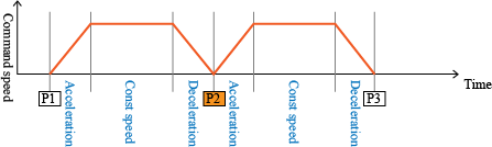 The pass motion starts the next acceleration motion during deceleration time before it reaches P2 as shown below. Therefore, the execution time is shorter than the end motion, which executes deceleration and acceleration individually.