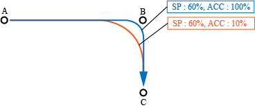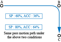 If arbitrary acceleration is set, the motion path may change. The figure below shows an example of 60% speed with both 100% and 10% acceleration and deceleration.