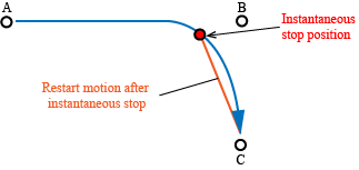 If an instantaneous stop is executed during deceleration of the pass motion and the motion is restarted, the robot moves to the position of the next step command value. Therefore, exercise due care if speed, acceleration, and deceleration are low.