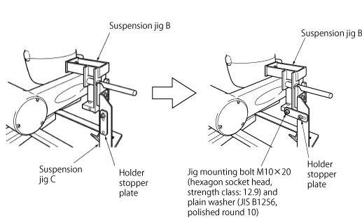 Using the holder stopper plates attached to suspension jig C, join suspension jigs B and C together.